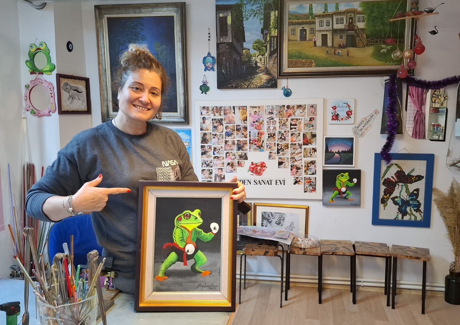 Balcı’nın çalışmalarında kurbağa figürü neredeyse merkezde yer alıyor. Bu bilinçli bir tercih. “Hazır figür vermem.” diyor. “Öğrencilerim ya kurbağa yapar ya da kurbağa temalı bir şey çalışır. Herkes kendi kurbağasını üretir.” Atölyede yer alan cam kurbağalar farklı renklerde, farklı duruşlarda ama aynı hikâyenin izlerini taşıyor.
