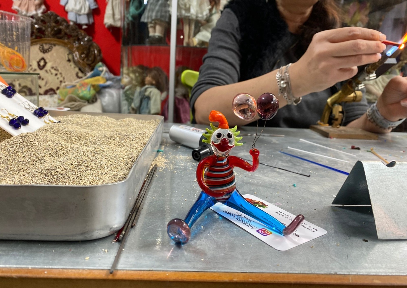 Münire Balcı’nın icra ettiği sanat, “Alevde cam şekillendirme” ya da kendi ifadesiyle “Alevde can.” Osmanlı’dan günümüze uzanan, gözyaşı şişeleriyle birlikte anılan bu teknik, bugün unutulmaya yüz tutmuş durumda. Bu sanatta kalıp yok. Cam, alevin üzerinde yumuşatılıyor, çekilerek, uzatılarak ve sündürülerek şekillendiriliyor. Balcı, yumuşak cam ve epetre camla çalıştığını belirterek süreci şöyle anlatıyor: “Her şeyi yuvarlak formlarla yapıyoruz. Cam çekilir, uzar, incelir. Şekil zorla verilmez.” Figürlerin detaylarında ise metal aletler devreye giriyor. Maşa, cımbız ve bazen de bir meyve bıçağı… Hayvan figürlerinin ağız ve yüz detayları yalnızca bu aletlerle şekillendiriliyor. Atölyede kimi zaman bir penguen, kimi zaman bir kurbağa alevin üzerinde can buluyor.